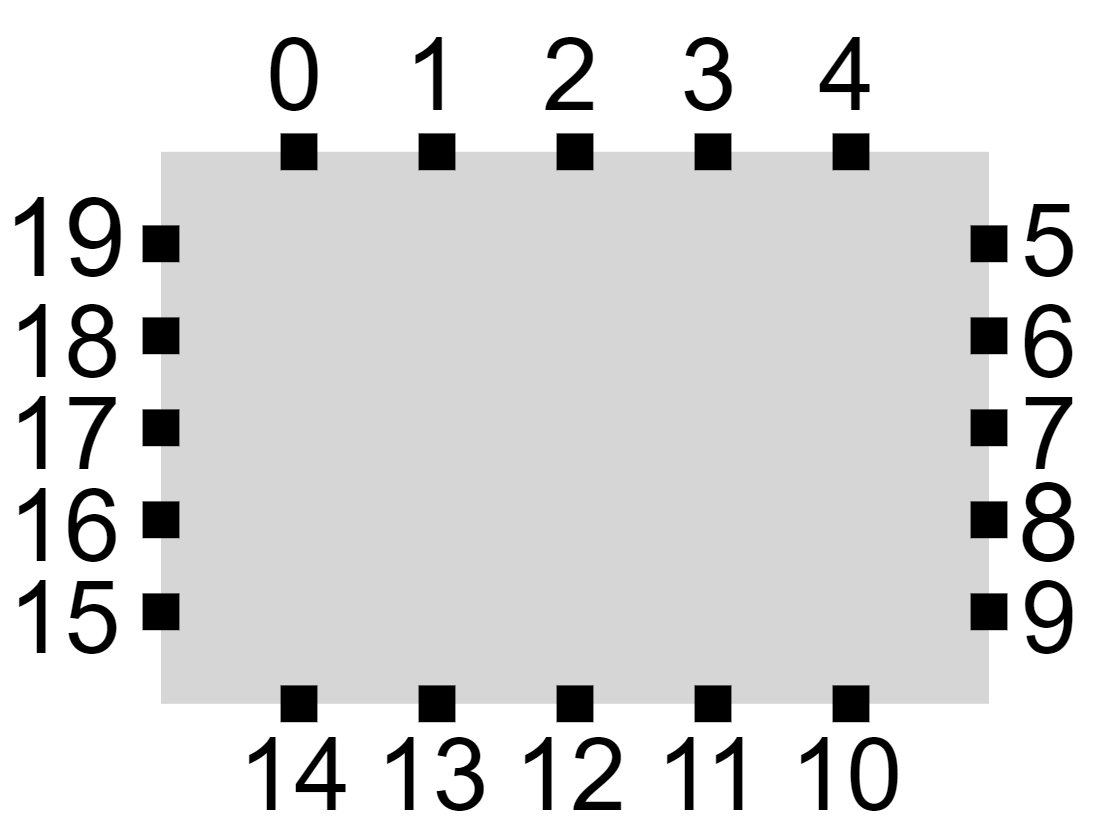 The ports are realized as discrete points distributed evenly around a node. The ports then can be indexed clock-wise as {0, 1, 2, … , 4k-1} starting at the top-left where k > 0 is the number of ports on each side, specified by the user. For instance, ports are distributed as follows when k = 5: